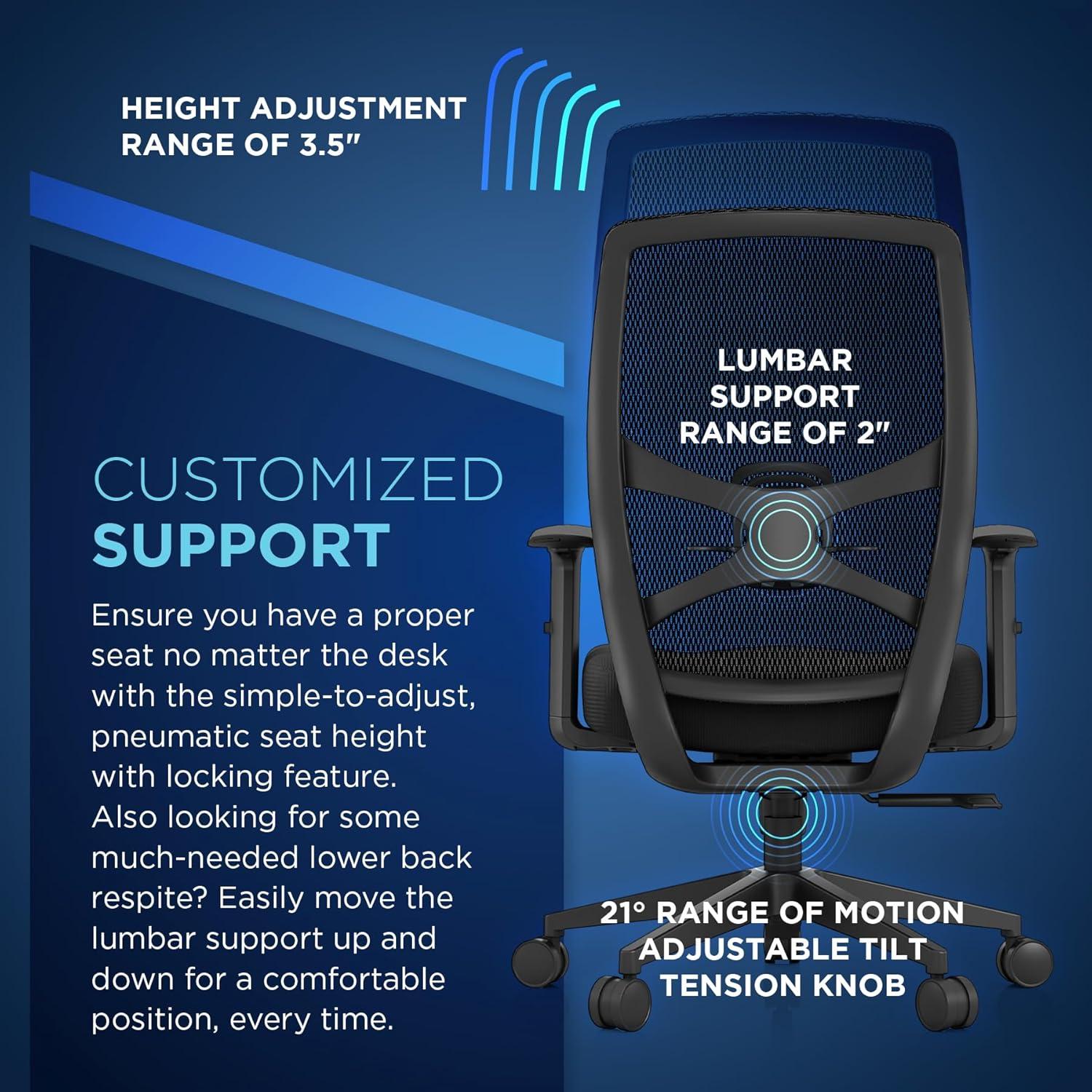 CUSTOMIZABLE COMFORT: Pneumatic seat height adjustment ensures you have a proper seat at your desk, and the adjustable tilt tension knob and lock-out feature ensure customized positionings
