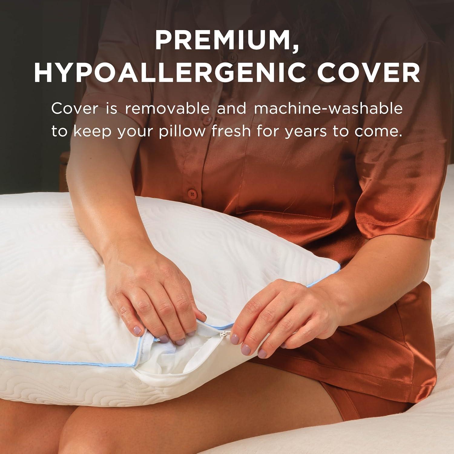 Premium Cover: A [100%] polyester knit and hypoallergenic cover is removable and machine washable to keep your pillow fresh for years to come.